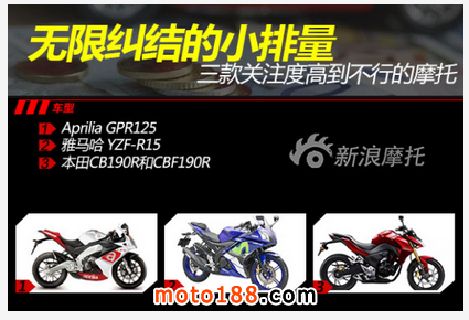 先介紹一下本期“培”你選車的三位主角:Aprilia GPR125、雅馬哈YZF-R15、五羊本田CB190R和新大洲本田CBF190R(以下簡稱190R)。2015年8月20日“最強150”雅馬哈YZF-R15上市、僅僅四天后Aprilia“王者級”小排量跑車GPR于江蘇大豐接踵而來、8月25日本田放出了“超越自我”的運動街車CB190R和CBF190R即將上市的消息。兩個月以來,大培子的微信號每天都沒閑著80%的問題都是關于這三款摩托車的,可見摩友們對它們的關注度是極高的,到底選哪款呢?您是否為之糾結?那好,這次我就和大家聊聊GPR125、R15和190R。