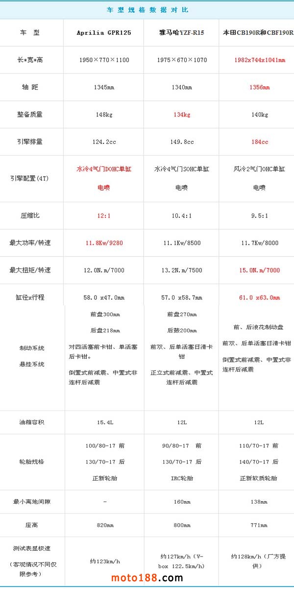 以款型分類的話這三款車真的很難放在一起做出評價,因為Aprilia GPR125是一款將125cc發揮到近乎極限的高比格仿賽車、雅馬哈R15是一款披著跑車外衣的高性能“街車”而本田190R則是一款高配置的純街車,三者單體性能不速又個性鮮明,高比格、高性能、高配置,三高碰撞各種糾結就差選車選到高血壓了。