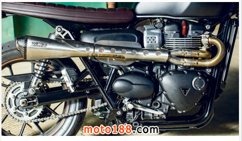 效能的提升也來自于輕量化的六速變速箱,搭配Triumph最新的電子油門與獨特設計的進氣箱,整體上雖然是新的系統,不過完全不影響經典雙缸造型,向后優美角度延伸出的雙排氣管,依然能譜出優美而飽滿的聲浪,電鍍的亮感,在Thruxton R上更是升等為不銹鋼電鍍質感。因應引擎的提升,Thruxton在底盤與懸吊上也有新的設定,除了cafe racer原有的低把位戰斗坐姿沒變之外,硬件上完全可調的前叉搭配17吋前輪的系統,Thruxton R升等為Showa全段可調big piston前叉搭配后雙槍Ohlins,也是全段可調,剎車則是浮動式Brembo碟盤搭Brembo單體鑄造卡鉗,連油壺都是Brembo。