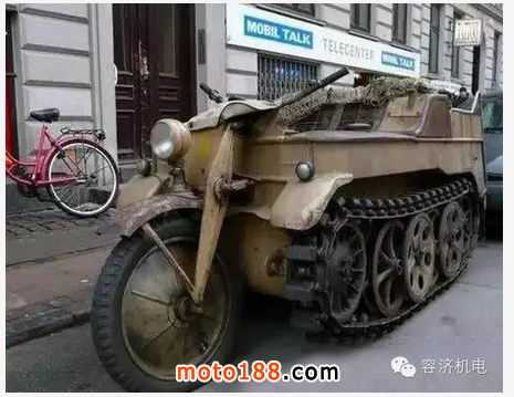 這是第二次世界大戰德國的軍用車輛,全稱應該叫“半履帶式裝甲摩托車”。德軍開發此車輛是為了進軍歐洲的地形,這輛坦克摩托車可以爬上24度的沙土和更堅硬的地面。