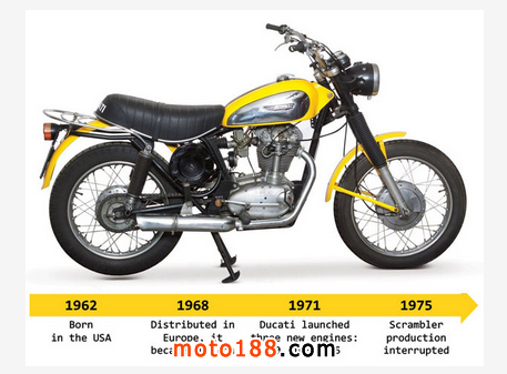 ●美國歷來是全球最大電單車市場,1962年第一代SCRAMBLER是專攻美國市 場,1968年才在歐洲推出,1971年分別推出50、100及125版本,1975年停產。當年全球只有 10%馬路是柏油路,因此SCRAMBLER是一款闊轪把舒適型的多用途車種。