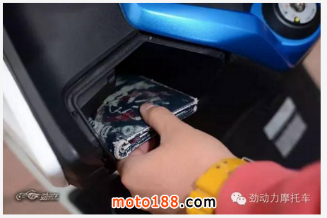 除了座下儲物箱,轉向柱兩側也是大多數踏板車喜歡利用的空間。在這方面,三車中當屬城市之星的儲物盒最大,其深度甚至可以讓人將整只手和手腕完全伸進去。圣甲蟲在這里的儲物盒就明顯寒酸了許多,好在兩側都可以用來放置東西,手機錢包等小件物品不在話下,而且蓋板還是帶鎖的。賽艇300的儲物盒與城市之星的位置相當,空間雖沒有那么大,但在拿取和放置物品時感覺很順手。