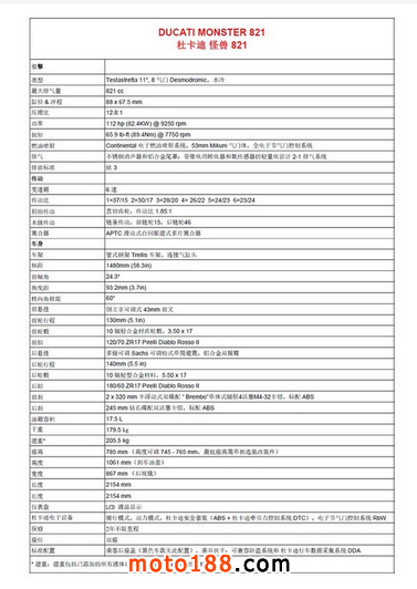 除此之外,高性能剎車系統(tǒng)、出色的減震懸掛、時尚的組裝件組合,以及杜卡迪出色的人體工程學設(shè)計,為這一意大利摩托品牌提供了最具魅力的中量級Monster怪獸。該車不僅駕乘極為舒適,配備創(chuàng)新性可調(diào)節(jié)高度的座椅;還結(jié)合了杜卡迪人性化、一鍵式可調(diào)騎行模式中的八級可調(diào)牽引力控制系統(tǒng)、三級可調(diào)ABS和三級可調(diào)電子節(jié)氣門控制系統(tǒng)。