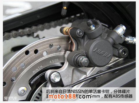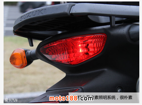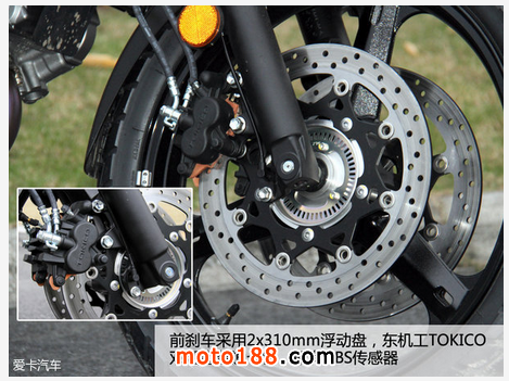 剎車方面全部來自日本企業,前剎車采用TOKICO雙活塞普通卡鉗,制動效果較為線性,剎車手柄手感很容易掌握。后剎車則來自NISSIN的單活塞卡鉗,制動力道與其他鈴木車設定雷同。