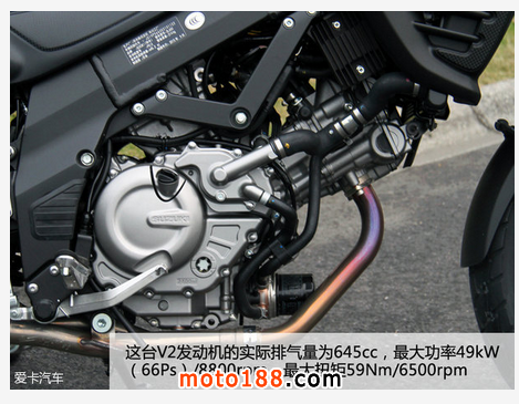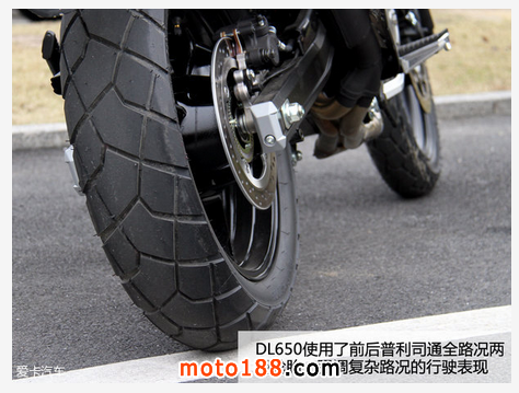 DL650動力方面采用一臺V2型雙缸DOHC8氣門水冷發動機,實際排氣量645cc,最大功率49kW(66Ps)/8800rpm,最大扭矩59Nm/6500rpm,與之配合的是6擋濕式傳動系統。輪胎采用普利司通復合型輪胎,提高了應對各種復雜路面的能力,規格為前110/80 R19、后150/70 R17的真空輪胎。
