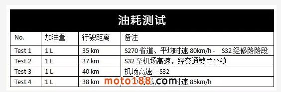為了更準(zhǔn)確地測(cè)試實(shí)際行駛中的油耗,我們?cè)诔霭l(fā)前抽空摩托車(chē)郵箱,并加注1L燃油。MARCO在保持約80km/h的平均速度騎行45公里后耗完第一升油。緊接著加注的第二升油行駛了47公里,第三升油行駛了50公里,第四升油行駛了48公里。LYRA再次突出地表現(xiàn)出了彎梁車(chē)“省油”的優(yōu)越性。