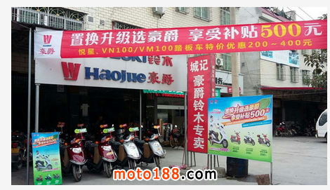 在廣東地區,國產銷量第一品牌豪爵,推出“淘汰超標電動車,置換升級享補貼”活動。自2015年11月1日起,凡將在用超標電動車、燃油助力車和舊摩托車進行淘汰處理,升級選購豪爵喜之星系列摩托車的用戶,將享受豪爵鈴木摩托車生產廠家提供的“置換補貼”500元,當場申請,當場兌現。