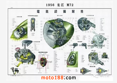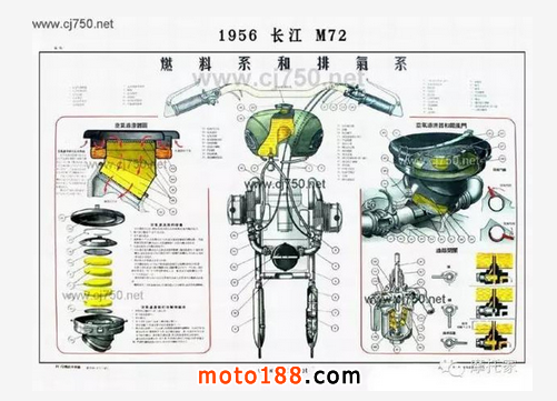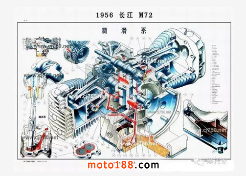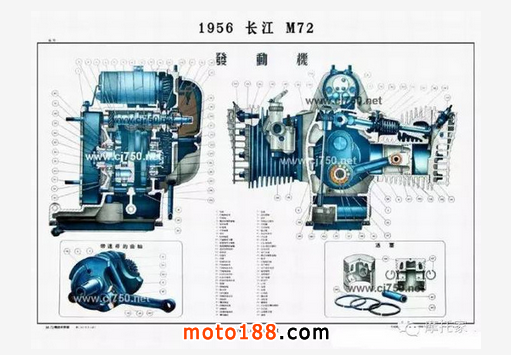 好了,開始講長江750的歷史。20世紀(jì)50年代,在蘇聯(lián)“老大哥”的支援下,我國參照烏拉爾T-72生產(chǎn)造出了我國自己的長江750M1型摩托車。當(dāng)時只知道仿制的是蘇聯(lián)烏拉爾M72,沒有圖紙,只好采取土辦法——拆,把樣車零件統(tǒng)統(tǒng)拆下來,然后實物測繪。光測繪畫圖紙就用于近3個月,整車完成共651份圖紙,車體部分圖紙編號1308A4,發(fā)動機部分圖紙編號1800A4。