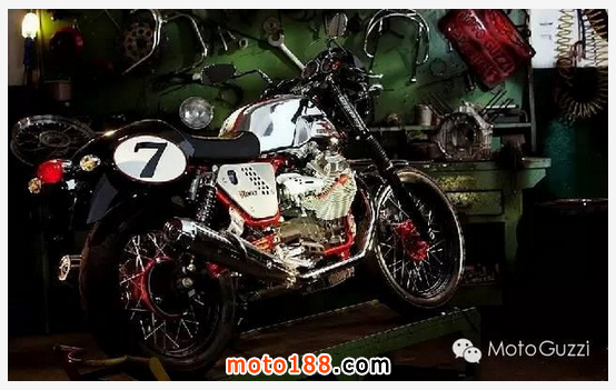 橫置V型90度夾角發動機;744cc排量,五速變速箱及軸傳動;黑色發動機蓋與車體紅色涂裝對比鮮明;裸露的機件更能彰顯機械魅力;雙側閃亮排氣管對稱又耀眼;稍微前傾的騎行坐姿;向70年代“Cafe Racer”致敬。