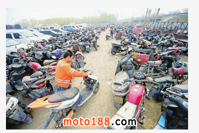 市區多條道路都懸掛了禁止摩托車行駛的指示牌二環北路一處違法車輛停放場,停放著數百輛無牌無證上路被查扣的摩托車。