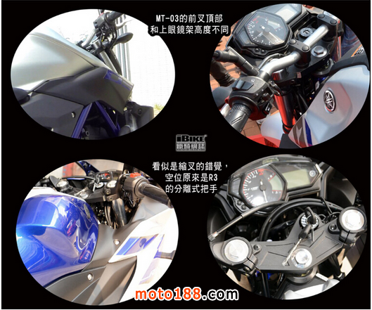 細看MT-03的41mm前叉,上眼鏡架從fork頂露出一截,看似縮了叉low低了頭擔。原來這只是錯覺。MT-03和YZF-03的上眼鏡架和前叉高度完全一樣,只是R3的分離式把手是直接套在頭叉頂部,所以眼鏡架必須預留轉向把手的厚度。而MT-03因采用街車把手,所以頭叉頂部沒有套上轉向把手而露出一截,做成縮叉low低頭擔的錯覺。