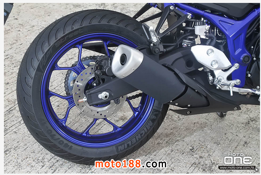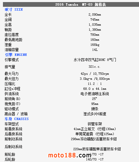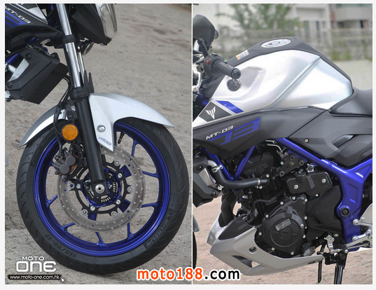 MT-03的心臟是水冷散熱的四沖程DOHC 8氣門雙汽缸引擎,實際排氣量是321c.c.,馬力輸出達到42ps,這數字對現今的入門車來說是十分理想。編者當日也有試駕,雖然車輛仍在全新車狀 態,但各方面操控很順暢,即使駛至交通燈拖落至1檔,也很容易踢上空波停車,無須花時間左搵右搵。還有儀表板設有檔位顯示,對于沒法透過引擎震蕩估計檔位 的新手來說是恩物,無須在5或6檔間猜來猜去。