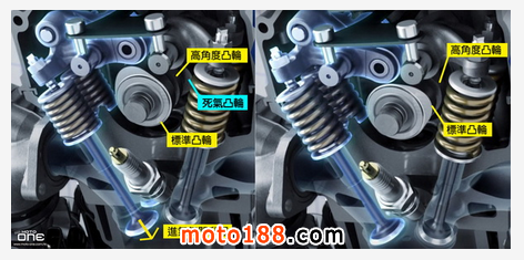●以這臺單汽缸引擎來說,除了原有頂開進氣氣門及死氣氣門外的凸輪外,在曲軸上還增加較高角度的進氣凸輪,以增加進氣氣門升程,在高轉時吸入更多空氣,死氣氣門則不受影響。引擎采用單凸輪軸4汽門及叉型搖臂式設計。