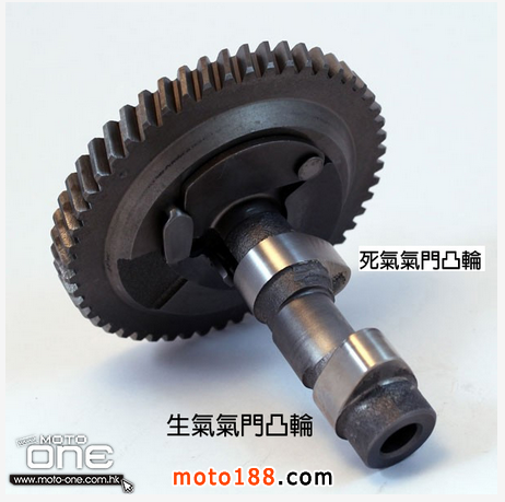●可清楚看到桃型的高角度凸輪較標準凸輪長,因此在高轉時可增加生氣氣門的升程,讓更多空氣及汽油進入汽缸。