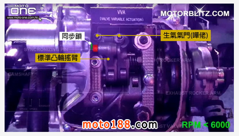 ●當引擎超過6,000rpm後,同步鎖把高角度凸輪軸搖臂串連,讓高角度凸輪進入工作狀態,增加進氣氣門升程,在高轉時吸入更多空氣及汽油進入汽缸燃燒,延伸高轉的加速力,機械結構與其他的可變氣門設計類同。