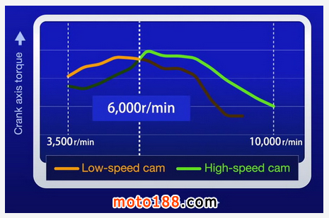 ●圖表顯示引擎低於6,000rpm時使用標準凸輪,可是引擎升至約5千多轉後馬力開始下降,當轉數升上6,000rpm後高角度凸輪隨即介入,延伸尾段馬力輸出。