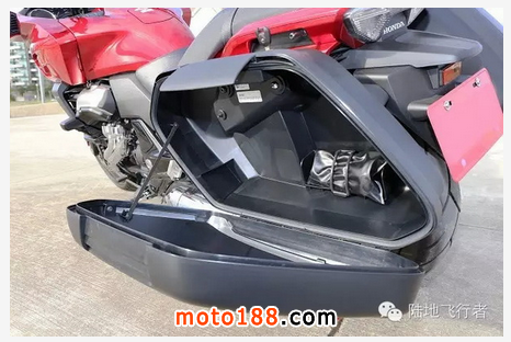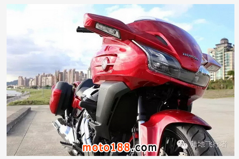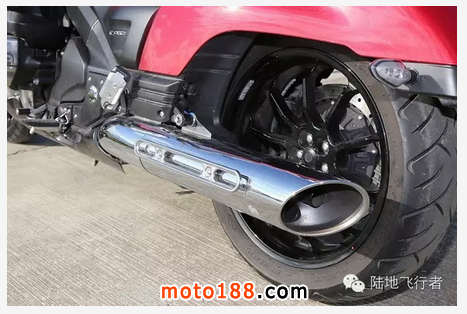 打檔桿的設計也相當特別,由于采用水平對臥引擎的關系,變速箱的方向和一般摩托車大不相同,打檔桿的設計當然也不太一樣。整體都包覆在變速箱的外殼內,僅露出打檔桿的末端。由于車體較重,后剎車碟盤采用了摩托車上較少見的雙層通風碟,讓后剎車不致過熱,可維持穩定效能。
