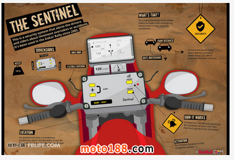 達喀爾拉力賽中的摩托車相比我們平時所見的訓練用越野摩托車,它高聳起來的車頭部分很顯然成為了一個引起人們關注的地方,而在車頭部分安裝的各種裝置,就是幫助摩托車手安全、順利完賽的必備武器。我們可以將車頭部分加裝的儀器分為三部分,在最上方的為比賽路書,毫無疑問,沒有路書,即使經驗再豐富的選手進入到四周看上去都一樣的沙漠,也都會像盲人一樣失去方向。而路書中所標注的在什么地點拐向哪個方位以及前方的地形和路況信息,這些信息對車手而言就如同導盲犬之于盲人。這部分看上去似乎很簡單,但是不要忘記摩托車手在比賽中大部分時間以150km/h的速度行駛,眼睛要目視前方的路、手腳還要配合操控車輛,因此,進行正確且即時的讀取路書中的信息也是一門絕活。