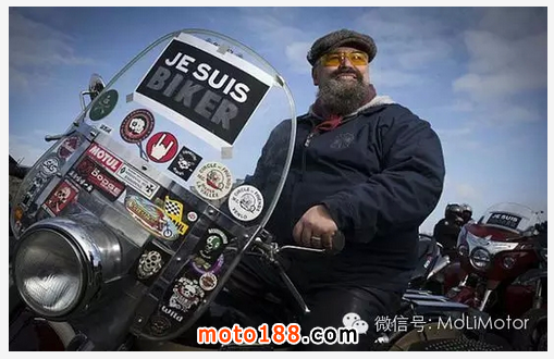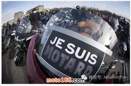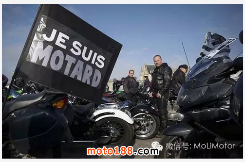 摩托車手騎摩托車穿過巴黎,許多人還帶著“我是摩托車手”(Je suis motard)的海報。