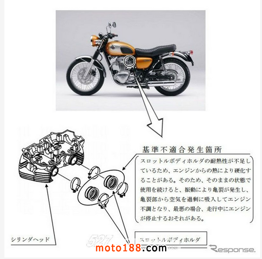 此外,W800發動機運行時產生的熱量以及發動機震動可能會使固定節氣門體的零件破裂,導致大量空氣進入發動機,影響發動機性能,并使發動機運轉異常。為解決這一故障,經銷商將為車主免費更換質量更好的零件,以解除事故風險。