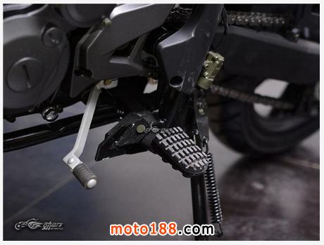 橡膠材質的前腳踏,雖然沒有專業越野摩托車的金屬質感,但是實際踩上去,感覺還是不錯的,并沒有想象中的那么單薄。