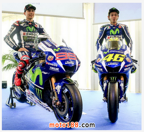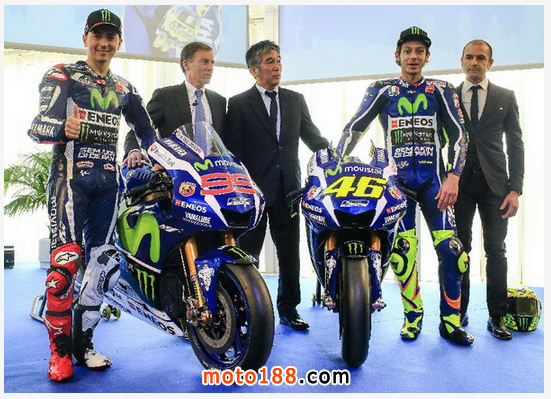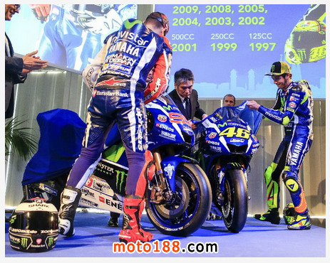 意大利車手瓦倫蒂諾·羅西(右一)和西班牙車手豪爾赫·洛倫佐(左二)在新車發布會上為新車揭幕。 當日,雅馬哈車隊在西班牙巴塞羅那召開新聞發布會,車手羅西與洛倫佐共同為新款賽車揭幕。