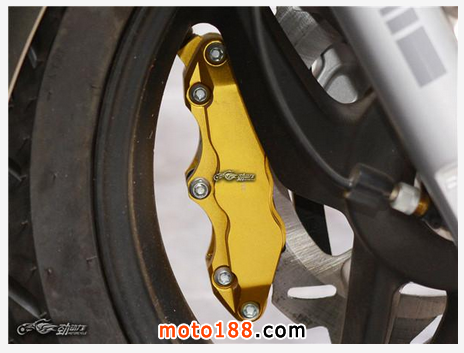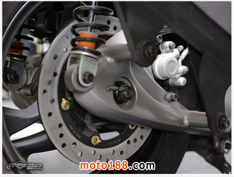 前制動的配置很強悍,采用了單鉆孔盤配對向6活塞卡鉗。
