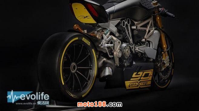 在Ducati DraXter側(cè)面印有90字樣,同時(shí)車尾攜帶了X標(biāo)志。同時(shí)離合器也被換上了具有象征意義的干式離合器,沒有頭燈、儀表,完全是想讓人跳出枯燥的參數(shù)本身,用身體感受速度的味道。