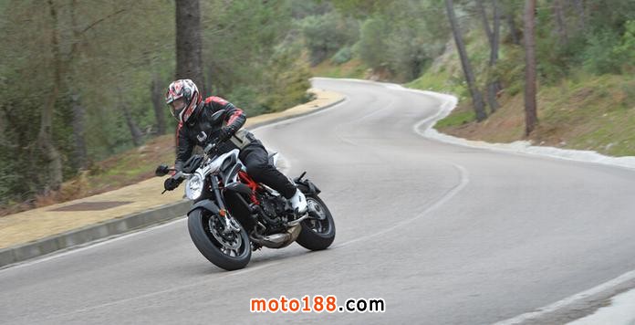 答案顯而易見!在Ronda山路上,大多是可以用100km/h左右的速度進出的彎道,照理說,軸距短的車輛在高速過彎的穩定性較差,但在New Brutale 800上,這樣的缺點卻不明顯,甚至有時我會懷疑這輛車的軸距是不是有官方聲稱的短,無論是高速或是低速彎,只要到了進彎點,完成煞車動作,啪!的一聲,車輛以平穩的姿態進出每個彎道。