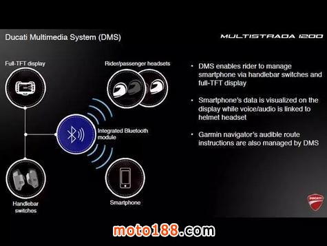 MTS 1200 S版標配了杜卡迪多媒體系統(tǒng)(DMS),可以通過藍牙與手機建立連接。儀表上能顯示來電、短信提醒、歌曲名稱等。此外,杜卡迪還為車主提供了APP,能讓騎行變得更加有趣。娛樂項目這么齊全,手機電量當然也要持續(xù)。在車座下提供一大一小兩個12V電源插口。方便途中手機隨時的電量補充。