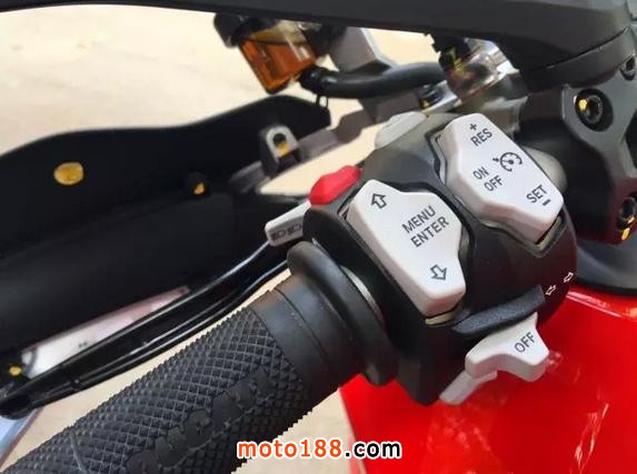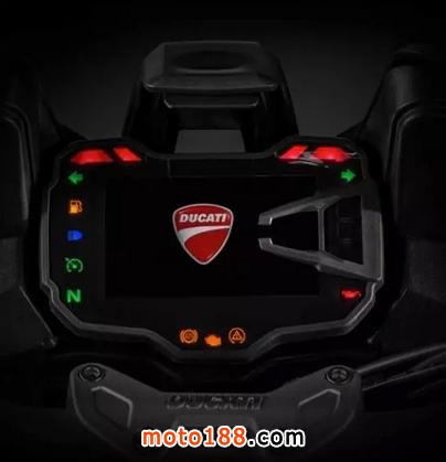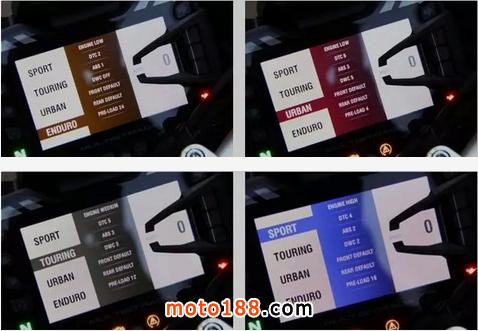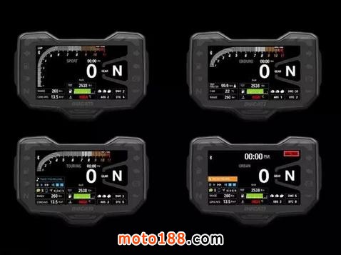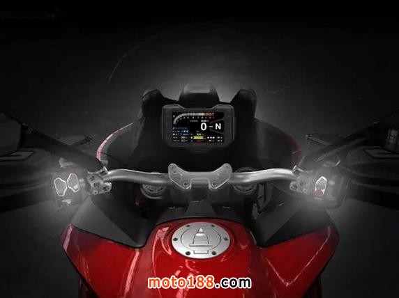 MTS 1200 S版車型裝備的5英寸全彩色液晶儀表有多種顯示模式,依照不同的騎行模式而不同,也可以由騎手自行選擇顯示模式。同時,顯示屏亮度也可以隨環(huán)境變化而自動調(diào)節(jié)。顯示模式共分四種:“運動”和“旅行”模式下,信息顯示得最全,“運動”模式下,發(fā)動機轉(zhuǎn)速顯示和Panigale上的一樣。在“城市”模式下,只顯示關鍵信息,以避免分散騎手的注意力。在“拉力”模式下,則增加了發(fā)動機轉(zhuǎn)速顯示。