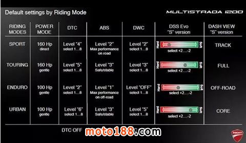 抬頭控制系統(tǒng)(DWC)會探測車輪轉(zhuǎn)速、傾角、俯仰角、加速度等數(shù)據(jù),在避免抬頭的前提下,輸出最大的動力。DWC對動力輸出的限制共分為8級,會在儀表盤上通過DTC燈的點亮告訴騎手。