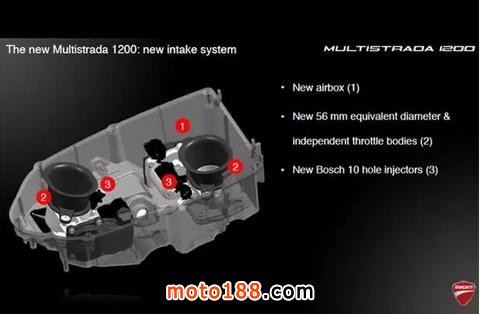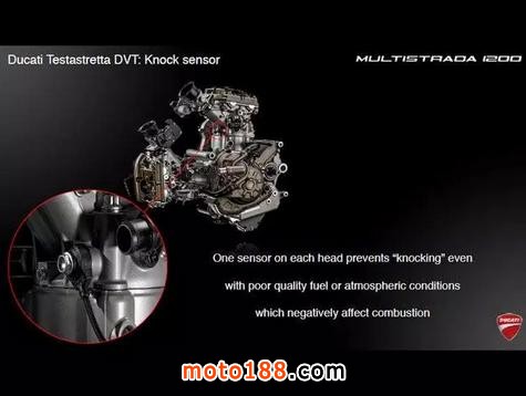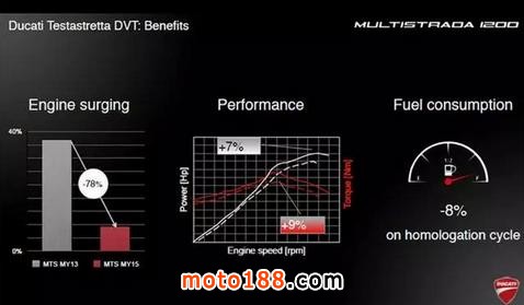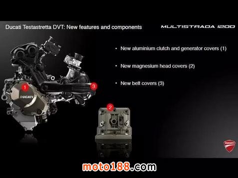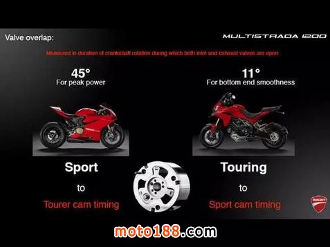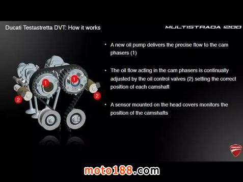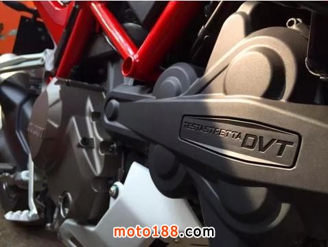 這臺發(fā)動機源自超級跑車1198 Panigale,其特點是高轉(zhuǎn)速時功率強勁,但在低速行車時卻會有較大震動,因此并不太適合慢速的城市騎行。由于MTS車系更加追求綜合路況下的表現(xiàn),借助DVT系統(tǒng),進排氣門的重疊角可以在偏重動力與直接的45°和偏重舒適與省油的11°之間無極調(diào)節(jié)。使這輛車既有超級跑車的激情、又有巡航車的穩(wěn)健。