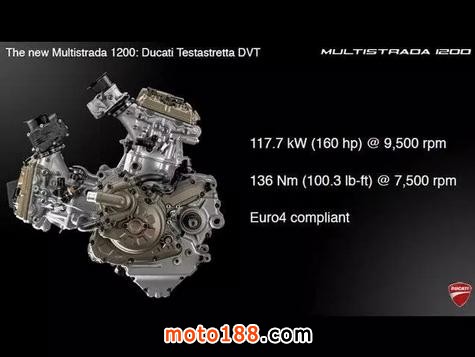 MTS 1200 用的是一臺新研發(fā)的Testastretta DVT雙缸發(fā)動機。在摩托車領域中,這臺發(fā)動機首次同時在進氣門和排氣門裝備了連續(xù)可變氣門正時系統(tǒng)(即DVT),因此大幅優(yōu)化了動力輸出——使得高轉(zhuǎn)的時候獲得更高的功率、低轉(zhuǎn)的時候得到更大的扭矩。