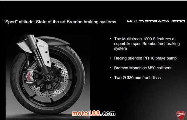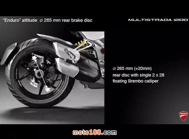 同時,為了增強后輪的制動能力,新MTS將后輪剎車盤直徑增加20毫米,達到265毫米。配備Brembo雙活塞浮動卡鉗。