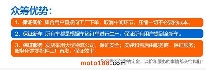 眾籌的優勢在哪里,牛摩網小編特地總結了以下幾條:我們眾籌的商品,都是價格超低,而且是全新車,另外,牛摩網全程對物流和服務進行監管,有問題找工廠,最大限度保證了購車用戶的利益。