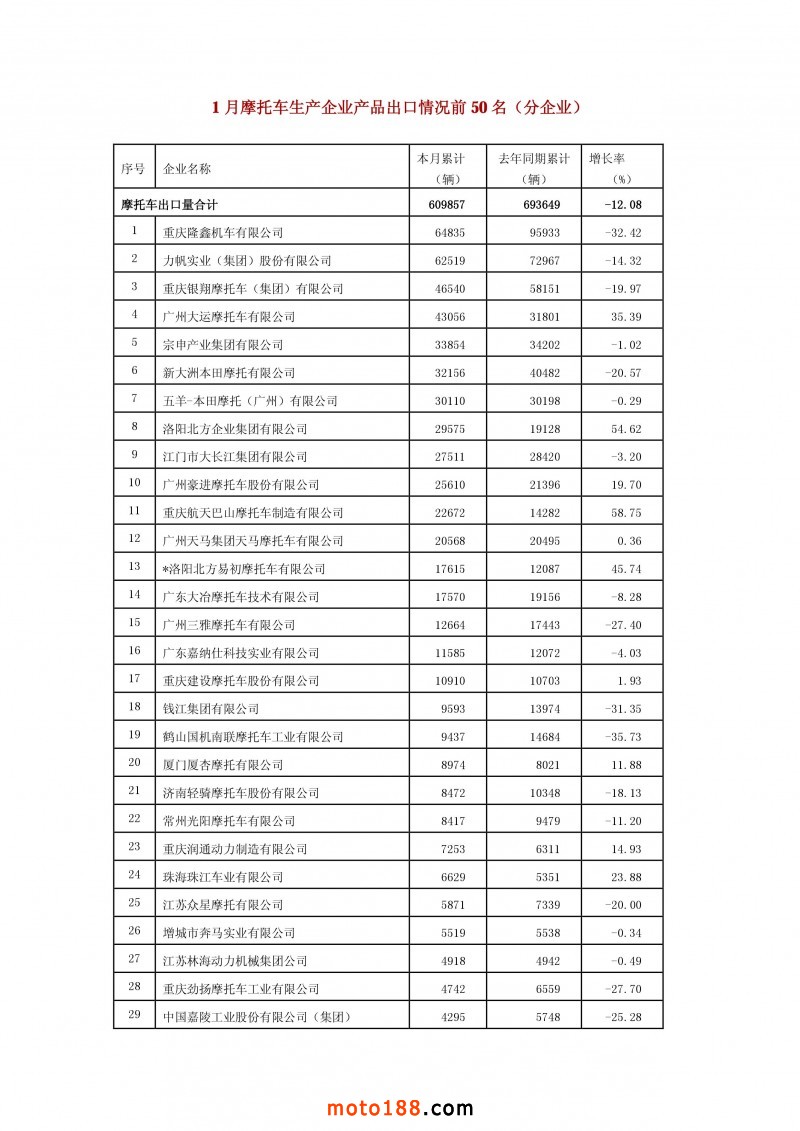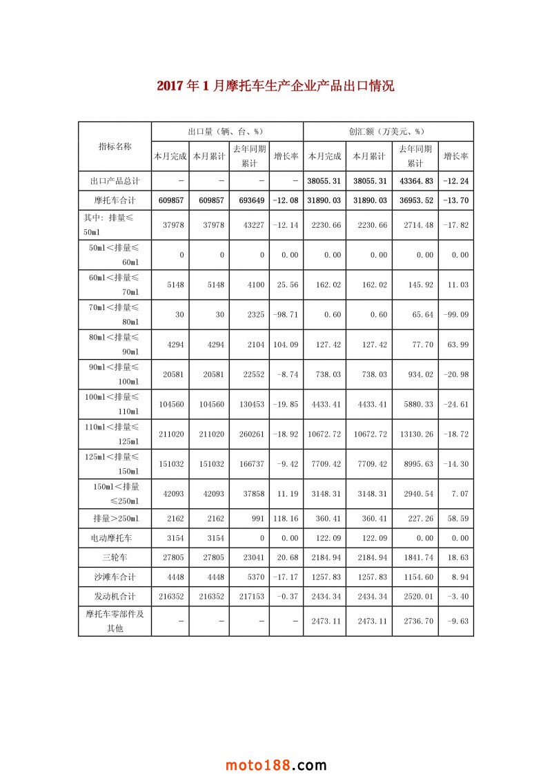 核心提示:2017年1月摩托車生產(chǎn)企業(yè)產(chǎn)品出口情況