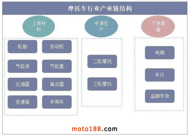 1885年,德國人巴特列布·戴姆勒發明了世界上最早的內燃機摩托車,1894年,德國的希爾德布朗-沃爾夫穆勒公司成為首個量產摩托車的廠家,并第一次將之稱為摩托;1896年,埃克瑟希爾公司開始生產摩托車;1898年奧林特-阿斯特公司開始生產摩托車……由此而始,摩托車開始進入全面量產時期。時至今日,現代摩托車已經發展得高度成熟,從車型方面,跑車、街車、巡航車、旅行車、探險車、越野車、踏板車,各種類型爭奇斗艷,從摩托車行業產業鏈來看,其上游主要是輪胎、發動機、離合器、變速器等原材料,下游銷售渠道主要是電商、車行、品牌專賣等。