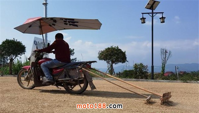 為搶住好天氣,曬谷時,他想了個新招:將兩個翻谷耙綁在摩托車上,駕著“坐騎”,不急不緩地在曬坪上翻谷。“以前,曬谷時,要安排專人負責,現在在送谷的間隙,就能翻一次,不必安排專人,而且翻曬更加均勻,工作效率至少提高3倍以上,人也輕松。”林平說。