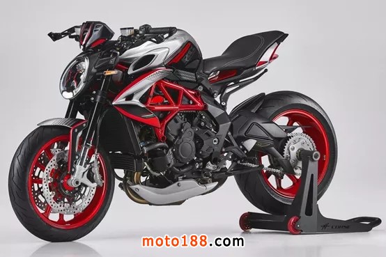 作為MV奧古斯塔Dragster系列設計最為極端的車型,DragsterRR SCS RC的設計顯然更偏向于競速運動。其設計復雜的側身曲線、鮮明的雙RR圖案、紅黑撞色的鋁制車輪讓整車充滿了肌肉感,即使是放在托架上似乎也完全阻擋不了其要沖出重圍的凜冽氣勢。 新版本Dragster RRSCS RC的798CC內(nèi)聯(lián)三缸發(fā)動機滿足了歐五標準,改進了座椅材質和電子齒輪傳感器裝置,使得騎手駕駛更加舒適和方便。