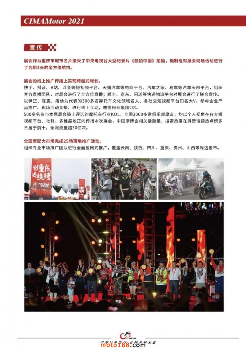 圍繞展會各大主題活動,邀請歷屆CIMA騎士、參與騎士評選的摩托車行業KOL及全國超過3000多家摩托車俱樂部深度參與展會各項活動,以個人視角在各大短視頻平臺、社群,多維度地正向傳遞展會各項信息,共建中國摩托車文化氛圍,形成圈層傳播聚合效應。