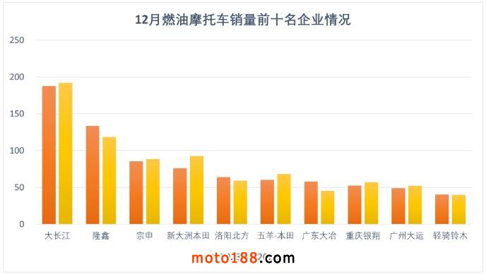 1-12月,燃油摩托車銷量前十名企業(集團)為大長江、隆鑫、宗申、新大洲本田、洛陽北方、五羊-本田、廣東大冶、重慶銀翔、廣州大運、輕騎鈴木,分別銷售187.74萬輛、133.52萬輛、85.54萬輛、76.13萬輛、63.93萬輛、60.26萬輛、57.88萬輛、52.54萬輛、49.03萬輛和40.23萬輛。