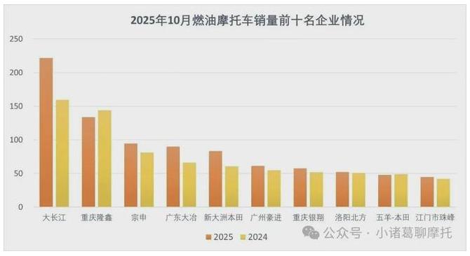 1-10月,燃油摩托車銷量前十名企業(集團)為大長江、隆鑫、宗申、廣東大冶、新大洲本田、廣州豪進、重慶銀翔、洛陽北方、五羊-本田、江門市珠峰,分別銷售221.63萬輛、133.75萬輛、94.58萬輛、89.96萬輛、83.36萬輛、61.36萬輛、57.48萬輛、52.06萬輛、47.89萬輛和44.74萬輛。