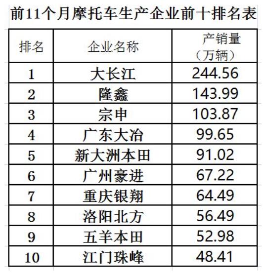 1-11月,燃油摩托車銷量前十名企業排名表如下:
