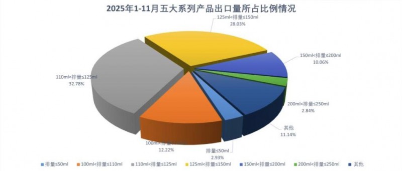 1-11月份,國產摩托車出口量位居前六位的系列品種分別是:125cc、150cc、110cc、200cc、50和250cc,從中可以看到小排量車型在海外市場更受歡迎,且呈現出了明顯的增長勢頭。