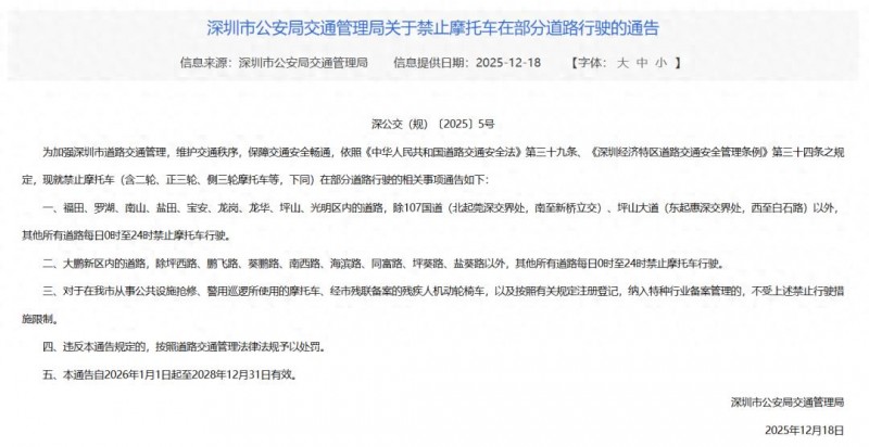 核心提示:重磅通知深圳市公安局交通管理局發布《深圳市公安局交通管理局關于禁止摩托車在部分道路行駛的通告》本次續發禁摩令有效期為三年