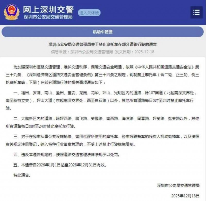 核心提示:2026年剛開局,兩個城市的摩托車主恐怕笑不出來。深圳交警一紙通告,福田、羅湖等9個核心區的道路,未來三年繼續對摩托車說不。