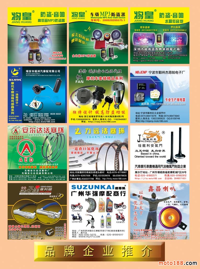 3、《中國摩托車配件生產企業大全(網址總匯)》第十一次升級版,在會上及各大市場同時發送。全國大市場還會送書上門,沒參會的企業可在門上坐等,愿意付郵費(快遞到付也可)的企業我們都會快遞送達。