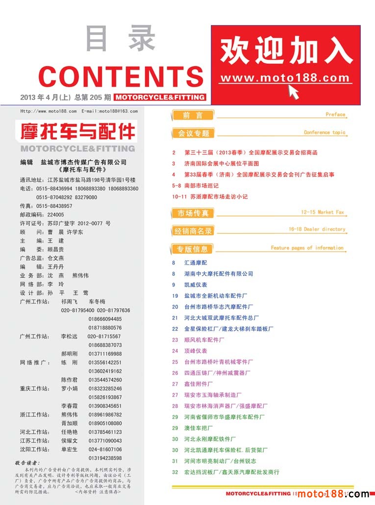 《摩托車與配件》自三月份正式改版后,雜志的    有較大的變化。因為是剛剛推出,市場還有一個適應時期,尤其一些市場人士有顧慮,擔心頻率加快以后廣告的留存期縮短,還有擔心印刷量會下降。為了慎重起見,我們雜志社在春運一結束后就安排部分人員去華東和華南及中南、西南等市場走了一遍。先后去了如皋、無錫、撫順、臺州以及商丘、鄭州、武漢、襄陽、荊州、株洲、長株潭、廣州、重慶、成都等市場,行程在隴海線南邊走了一圈。到市場第一線汲取客戶的意見,了解市場的發行,調整了部分發行點,并新建和恢復了六個發行點,進一步完善市場的發行。雜志改刊后不僅僅是期數的變化,更是一個系統的工作,這涉及到我們服務的提升,整個系統的升級。在這一期雜志內,我們會用一定的篇幅介紹我們所走過的市場的具體狀況。目前我們是行業長期調整以來僅存的專業媒體,一方面我們面臨市場的風險,如果不努力我們也會和前面已經淪陷的媒體一樣,被市場拋棄。另一方面來自我們內部及系統內的風險,即我們的管理和服務是否和雜志升級一樣,也在同步提升?我們面臨新的改革發展機會,我們能否把握住、把握好?在進行科學的發展時,不能因為太 太快而摔跤,所以我們雜志在今年的發展目標是:緊跟市場、穩中求進。在外銷市場面臨銷售不暢的現實情況下,如何服務好內需內銷市場,這也是我們和生產型企業共同要探討的課題。通過對市場的走訪,我們有了目標和方向,也有了信心和動力。正因為此,我們三月份推出雙期后所產生的一系列問題,我們都在妥善應對。今年四月份濟南會議,我們會展現我們去冬今春的勞動成果: