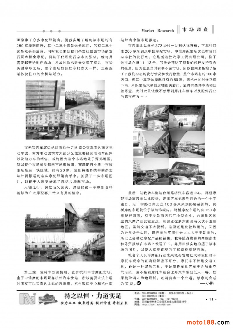 《摩托車與配件》自三月份正式改版后,雜志的 有較大的變化。因為是剛剛推出,市場還有一個適應時期,尤其一些市場人士有顧慮,擔心頻率加快以后廣告的留存期縮短,還有擔心印刷量會下降。為了慎重起見,我們雜志社在春運一結束后就安排部分人員去華東和華南及中南、西南等市場走了一遍。先后去了如皋、無錫、撫順、臺州以及商丘、鄭州、武漢、襄陽、荊州、株洲、長株潭、廣州、重慶、成都等市場,行程在隴海線南邊走了一圈。到市場第一線汲取客戶的意見,了解市場的發行,調整了部分發行點,并新建和恢復了六個發行點,進一步完善市場的發行。雜志改刊后不僅僅是期數的變化,更是一個系統的工作,這涉及到我們服務的提升,整個系統的升級。在這一期雜志內,我們會用一定的篇幅介紹我們所走過的市場的具體狀況。目前我們是行業長期調整以來僅存的專業媒體,一方面我們面臨市場的風險,如果不努力我們也會和前面已經淪陷的媒體一樣,被市場拋棄。另一方面來自我們內部及系統內的風險,即我們的管理和服務是否和雜志升級一樣,也在同步提升?我們面臨新的改革發展機會,我們能否把握住、把握好?在進行科學的發展時,不能因為太 太快而摔跤,所以我們雜志在今年的發展目標是:緊跟市場、穩中求進。在外銷市場面臨銷售不暢的現實情況下,如何服務好內需內銷市場,這也是我們和生產型企業共同要探討的課題。通過對市場的走訪,我們有了目標和方向,也有了信心和動力。正因為此,我們三月份推出雙期后所產生的一系列問題,我們都在妥善應對。今年四月份濟南會議,我們會展現我們去冬今春的勞動成果: